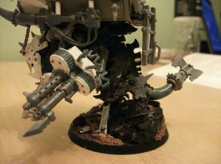 Finally though after hours of trying to hold four arms in a acceptable pose, i took a saw to the top of the Carnifex’s back to make a platform for the cabin. I got to work on the head armour then, putting the plates together, and putting in some chains running up to the cabin.