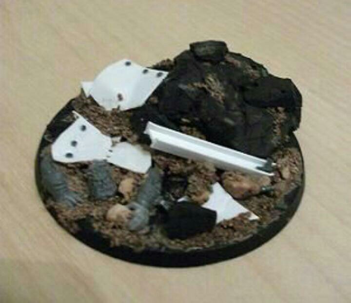 I also worked on the base along side the other things. I stuck some rock on the base made out of some foam. A sheet of crumpled plasticard and some ork bits to have poking out from under the plasticard sheet.