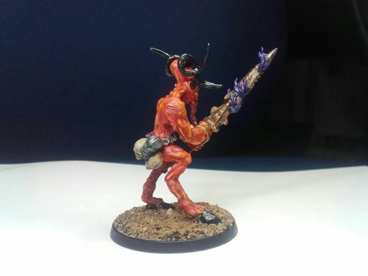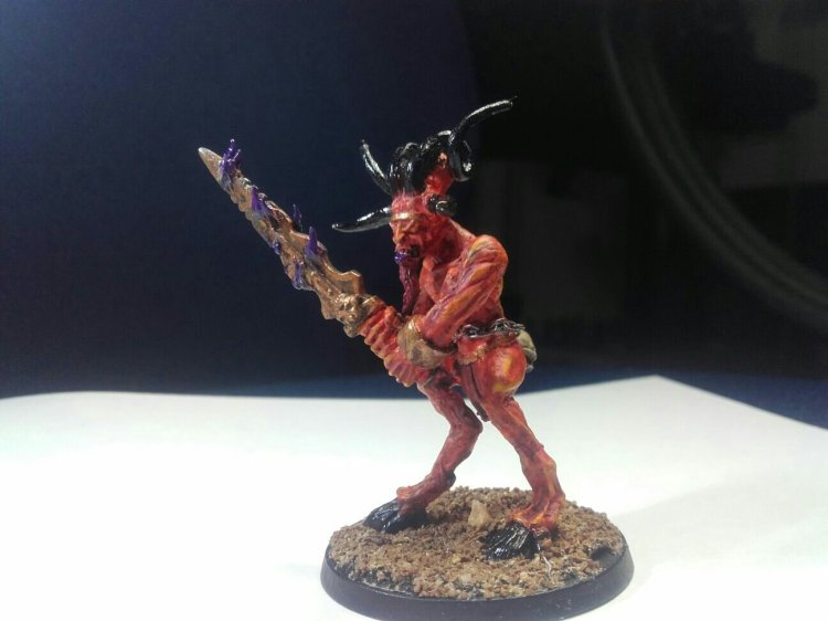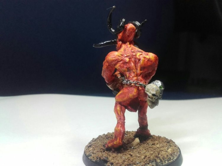 By this point… no, well before this point, i had obviously noticed this was an insane undertaking for all of the other Bloodletters. I didnt want to do it again, he certainly wouldnt. Never waste an opportunity though… He was bigger than all the others now, he could easily be a champion… Or… A HERALD! I gave him cloven hooves to replace the feet, lengthened his horns, some licks of flame on his sword, and gave him a belt of trophies. Finally i plopped him on a larger base.