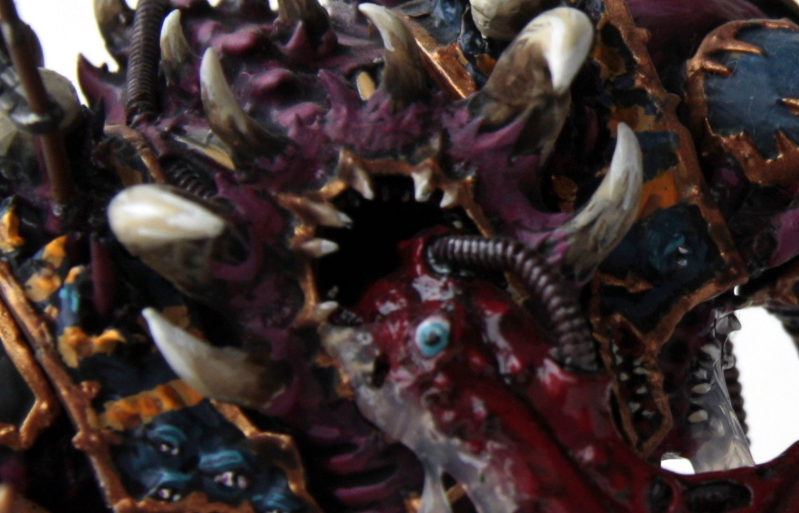 So that was the pose dealt with but I definitely wanted to do more to personalise him. My army is all Tzeentch so a few continuing themes i try to put somewhere are bird parts, weird mutations and possession amongst other things. The shoulder pad i put on already has a daemon face in it. On the feet, i cut of the two side toes, leaving one at the back and two at the front to make it more like a bird foot, then I greenstuffed talons instead of the nails. I turned two of the collar horns to face outwards just for more variation and i think it makes it look more fractionally aggressive. I don’t really like spikes for no reason, my chaos army is relatively spikeless… But in order to give the Brute some height and a different silhouette from the standard Helbrutes, I added two banks of spikes busting out of the shoulder armour. The biggest and most obvious modification is my Helbrute’s face. I knew i wanted to make it different when I built it, i just didn’t know how at the time. I did intentionally omit the face from the build though. For a long time during a period of “I don’t want to screw up this next bit”, instead of a face was a curved and crooked paperclip. Eventually i got to work sculpting a tongue onto the paperclip. I incorporated some very short guitar string pipes in there and threw on some eyes for good measure.