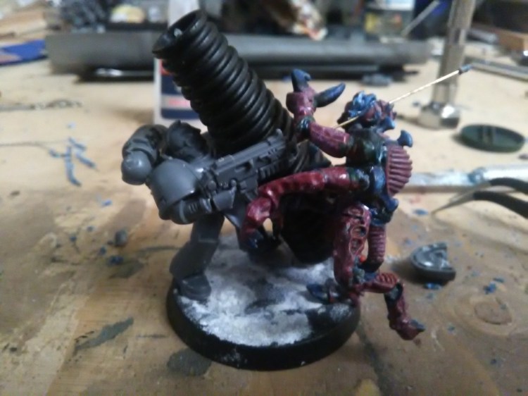 I wanted to capture the head shot, which meant i had to have a reasonably realistic and dynamic response, visible in the ‘Stealers body. Being a Space Hulk Genestealer… Snippy (as i shall affectionately refer to him from now on) wasn’t terribly poseable. I cut almost every major join in the body, poking scrap plastic into the gaps to open up joints and turning others.