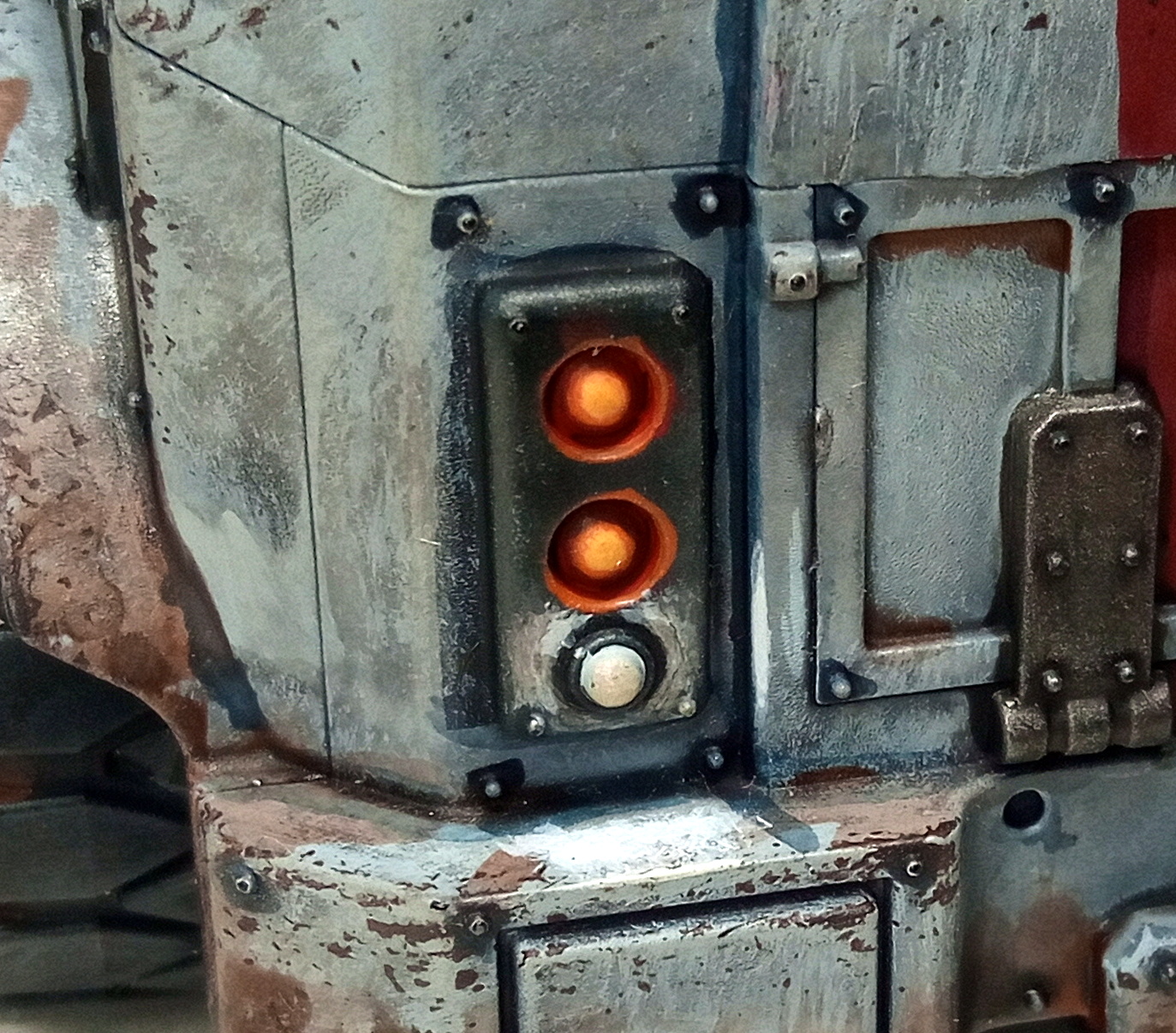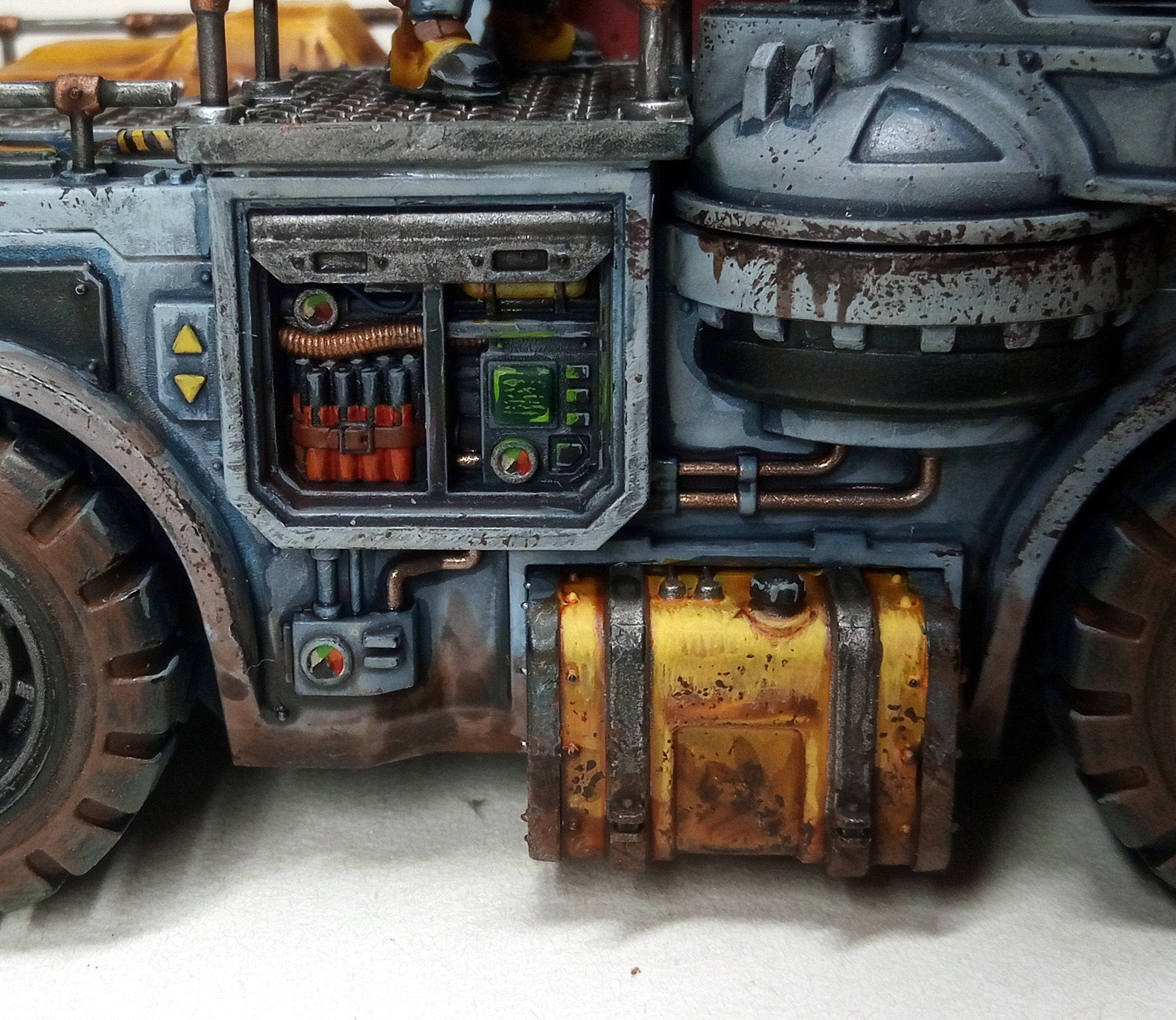 1. Do you mean the ones around the turret? I literally just winged it, but I think I used Agrax and nuln oil layers because if you just do one then they look to uniform. Maybe look up some greasy/oily streaks on some machinery for reference? I I have actually tried them once before on some terrain.