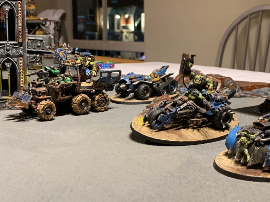 I wish I had taken more WIP shots but honestly he was so enjoyable to paint I didn’t stop to take a pictures and only stop at the end of my painting time. I was also desperate to use him in a game. Here he is below riding in his trukk before assaulting and almost wiping out a unit of 10 pox walkers on his own. They then turn and ran and Buzzgob got his head exploded with smite the next turn.