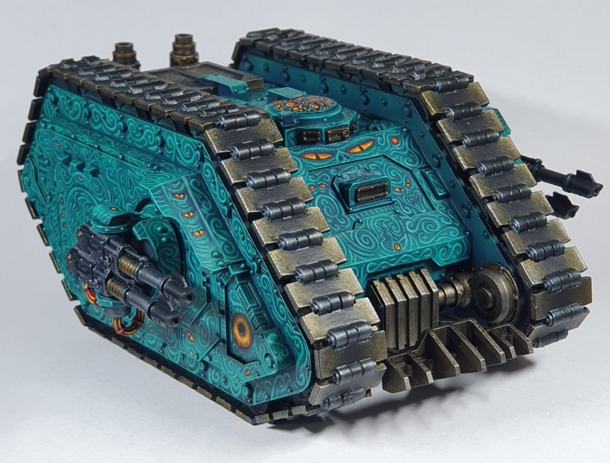 This month I pledged a single model. I normally paint so much faster than a model a month. But not all models are as fancy as a forgeworld land raider I guess. I knew the plan before I started. I wanted a chaos tank that wasn’t covered in spikes and trim, so I aimed to get “Daemon trapped, well, bound into the machine” look. In my head the whole thing would be constantly moving, swirling, eyes blinking, appearing, disappearing, that sort of thing. I went slow, it’s all documented on twitter. Would I try this again? Not right off the bat!