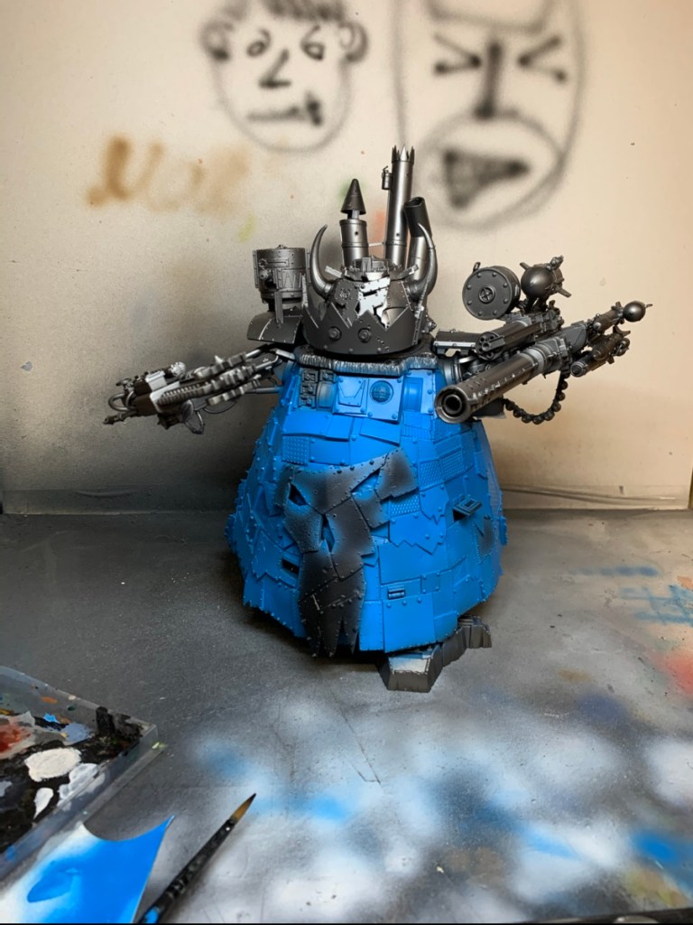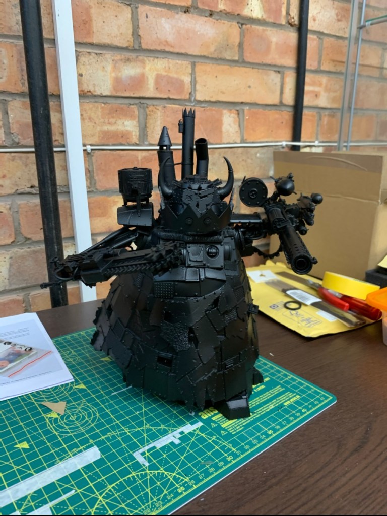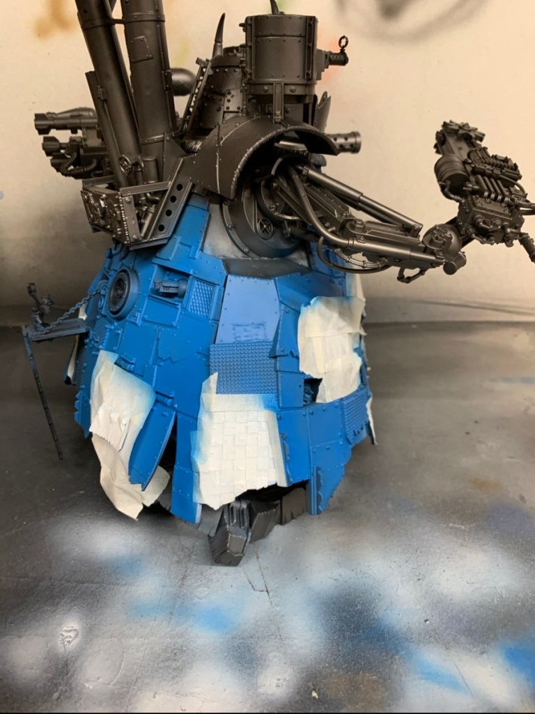 I knew this was going to be an interesting model to paint. I planned to use the same method as my buggies which was spray black, silver and blue and then mask off sections that are to be white with masking tape and in the patterns I felt orky enough.