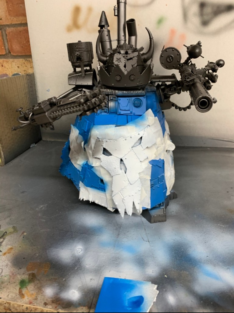 Masking was done in a negative fashion leaving the areas exposed i wanted to be white. I’ve done both this and sprayed white then covered the bits I wanted to remain white. I prefer this method as it bleeds over (the opposite to what you would normally want) and this looks more slap dash perfect for the Ork vehicle.