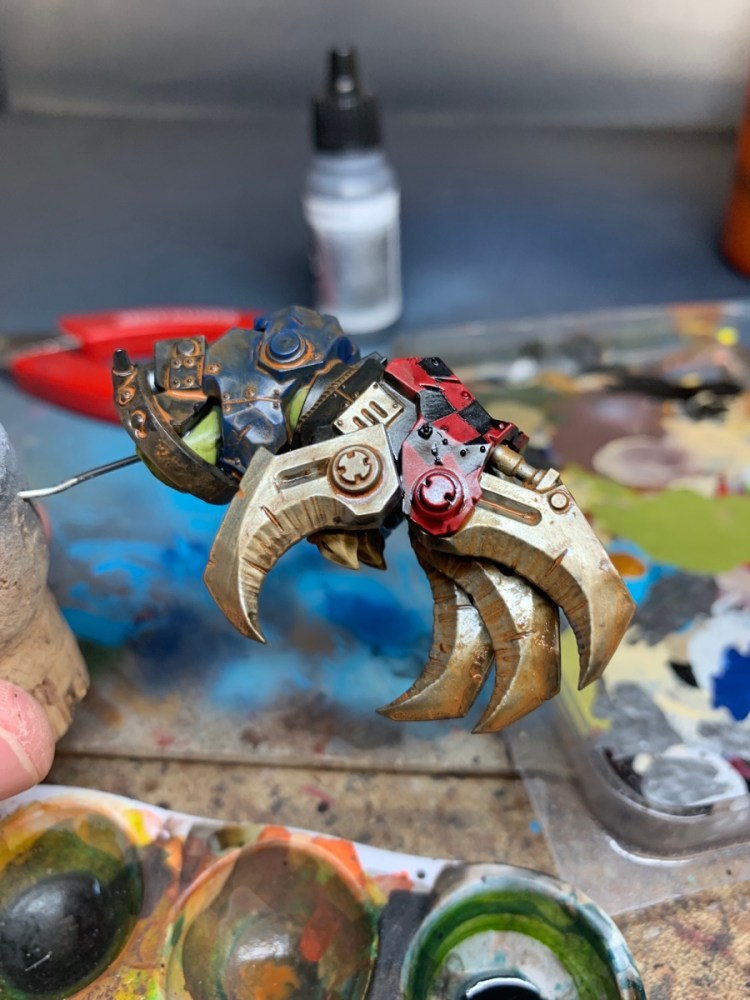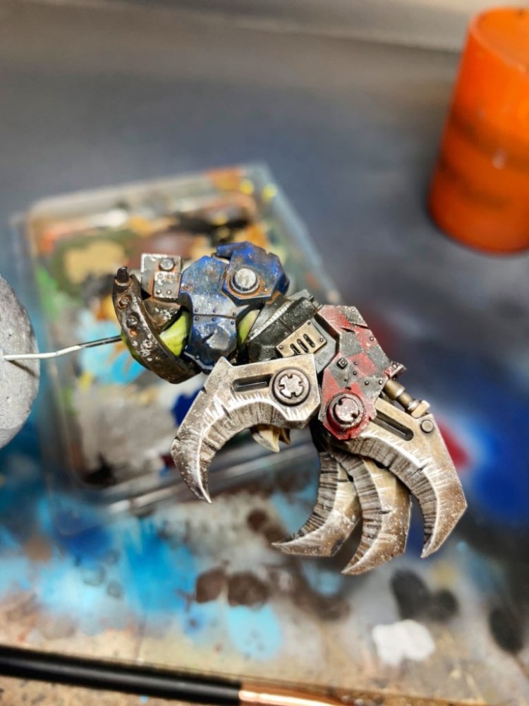 I then split down the model into sub assemblies and started on the claw, you can see the base colours blocked in and then I started to weather this takes a while but is mega fun. Take you’re time and go slow.