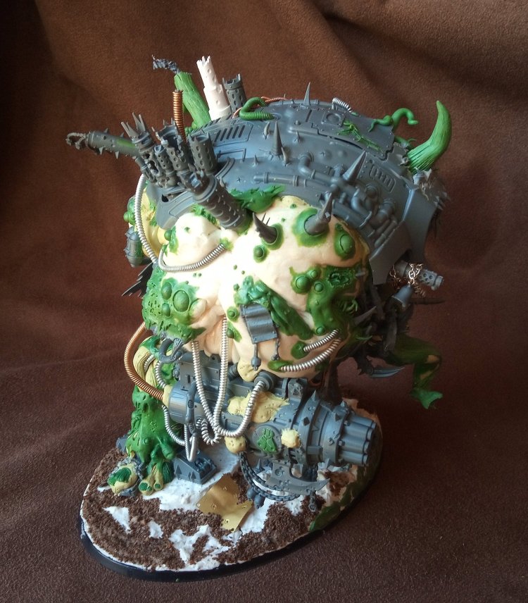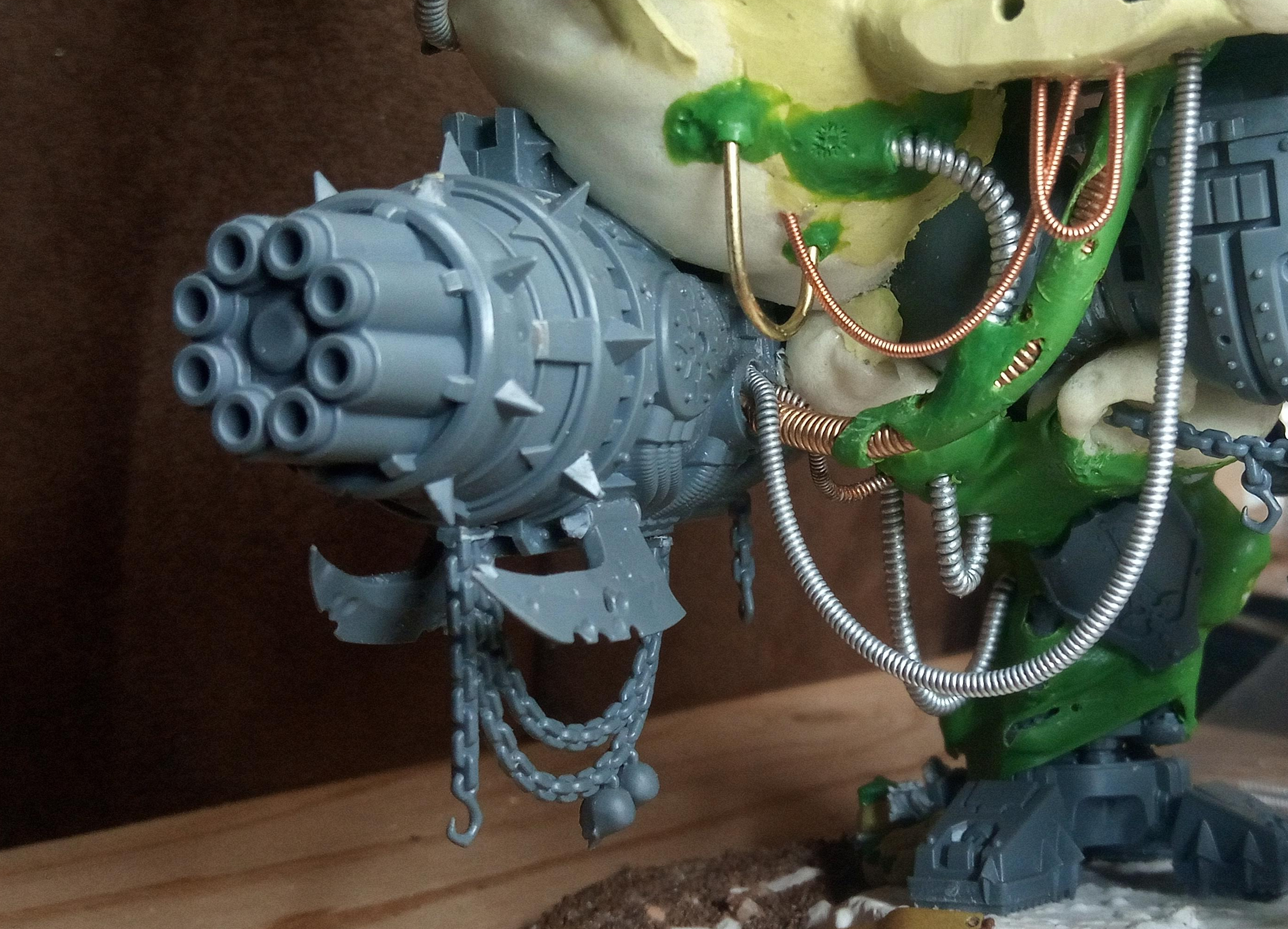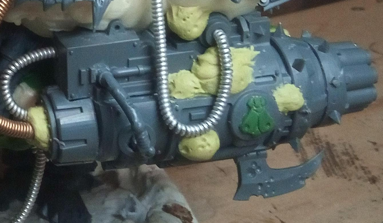 I then started adding more details like cables from a helbrute kit, more cables (this time the easily poseable ones from Zinge), I cut away the eight pointed chaos star and green stuffed the fly symbol that I knew Krakendoomcool added to a lot of his death guard minis. I did similar on the inside of the gun, throwing pipes and cables all over the place as inspired by Sulkan‘s awesome, gritty, Nurgle stuff. I threw on some chains from the knight kit and inspired by Krakendoomcool’s own Helbrute I added some under slung axe blades to the gun. He loves a homage, so for his present to contain some references to his own work seemed appropriate… it was also at this point I realised that the pose of the whole knight had an uncanny resemblance to the helbrute too!