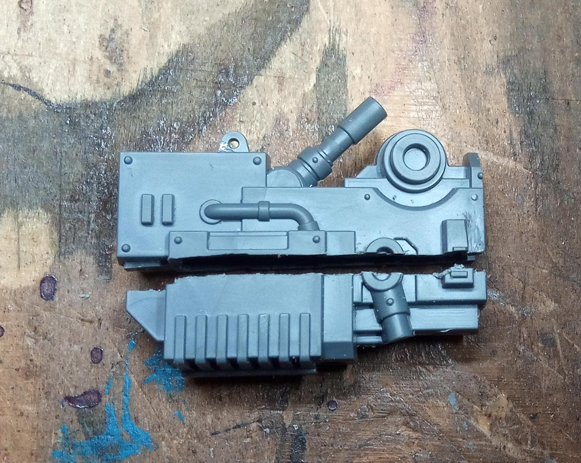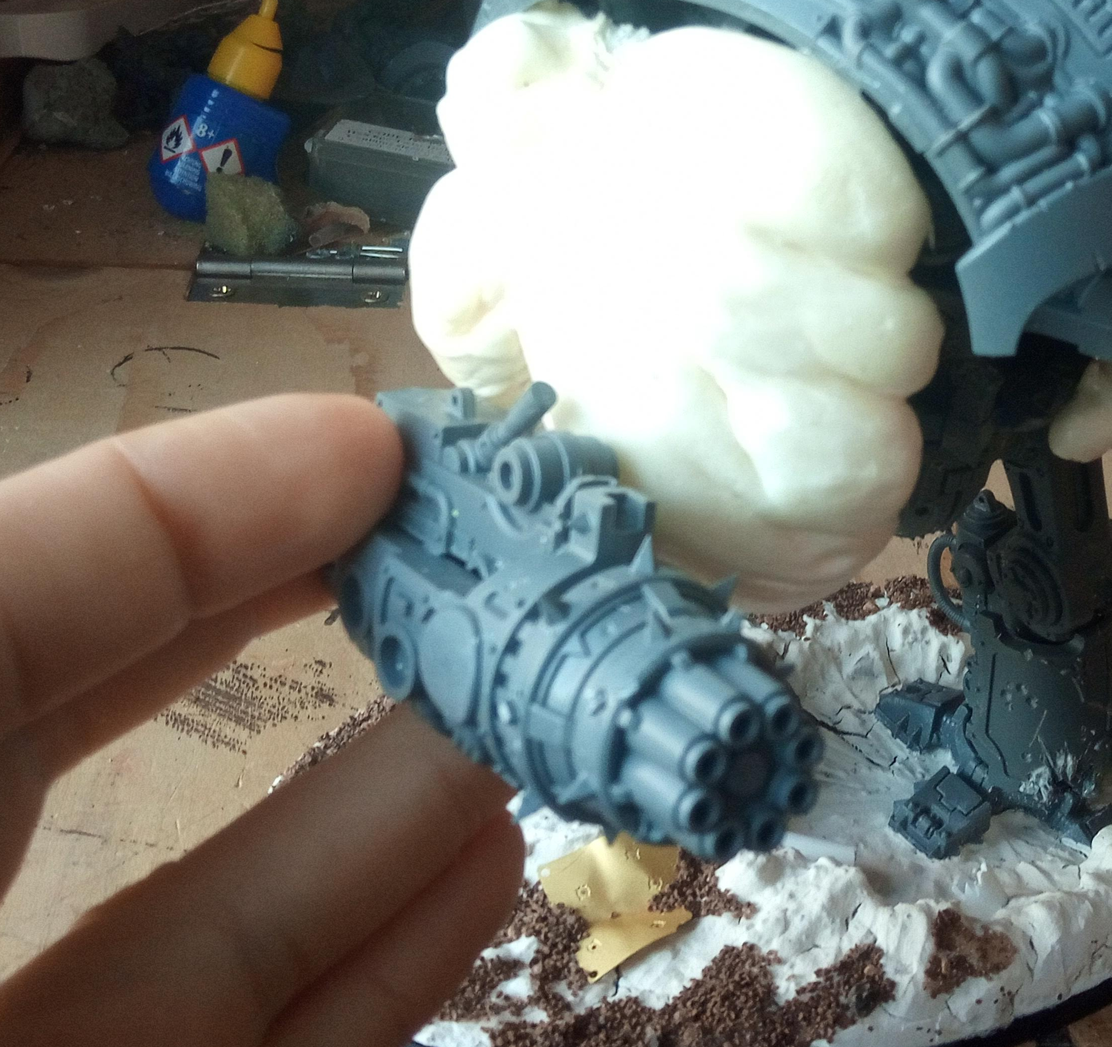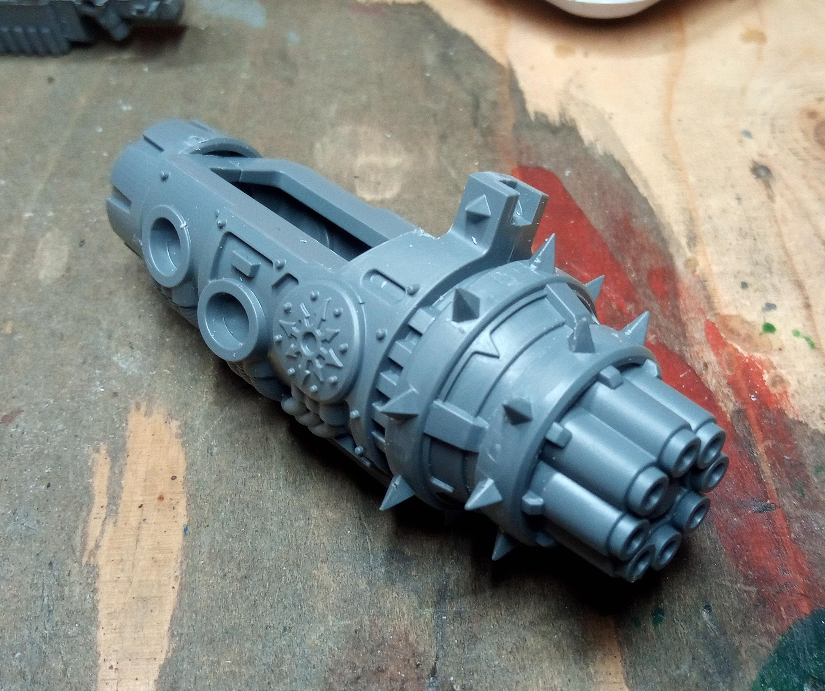For this arm, I chose to go with what is widely accepted as the universally useful ranged weapon, the avenger cannon, so I could increase the likelihood that the recipient of the model would find it useful. Even if it’s rules change, who doesn’t love a gatling cannon/minigun? I didn’t have a spare Avenger cannon though so… I would have to see what I could come up with. I had some bits left over from when I got a Lord of Skulls sprue for the Khornate Knight, fortunately this had the gun on it which is a cyclical, multi barrel style gatling gun (it had 8 barrels rather than 7 but beggars cant be choosers…).