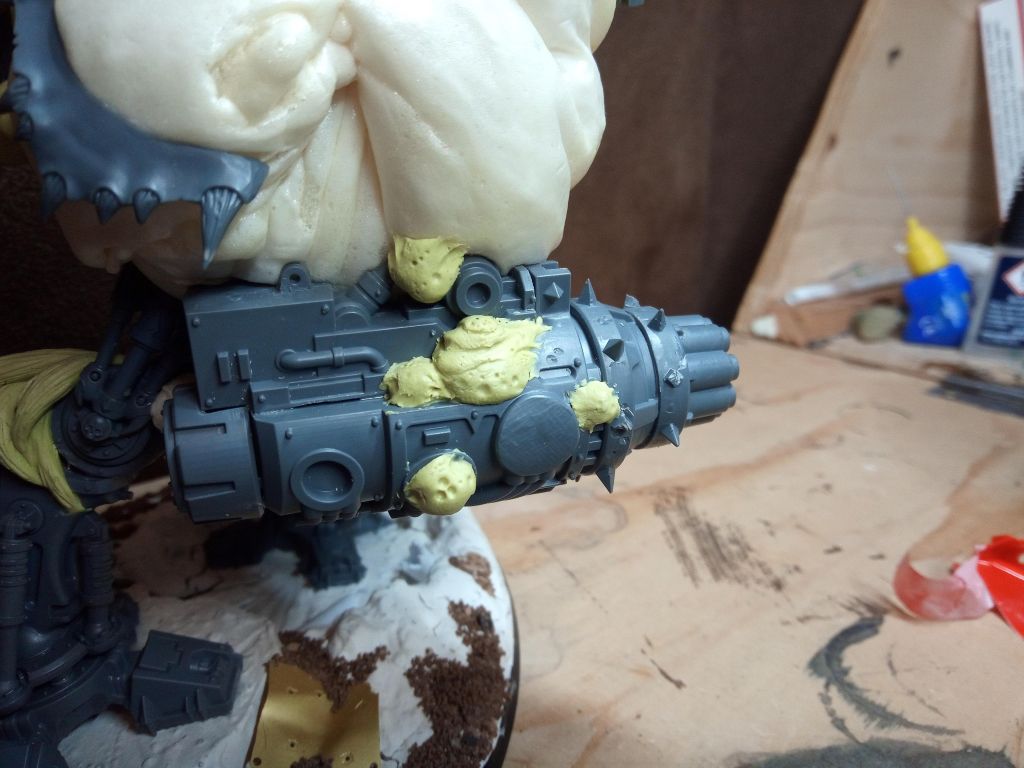 I knew I would have to mess around with it a bit but there was no “arm” to speak of this side of the knight, more like a big fat Akira style, bursting growth of flesh. So just had to sort of jam it into it somewhere that looked kind of right. The gun from the lord of skulls had a useful hollow, but attach that bit to the fat would have made it sit too far forwards or sit awkwardly at an angle. So I needed to bulk it upwards so I could sort of tuck it into the side of the fat. I cut the body of one of the knight guns in half and sat that on top of the gun before offering it up. I was happy with how it looked.