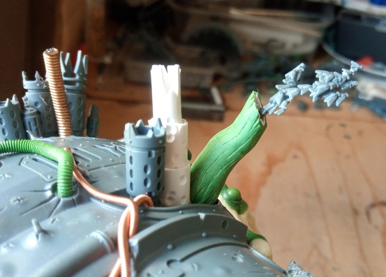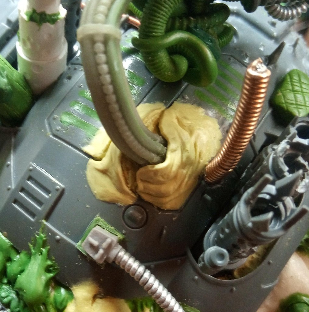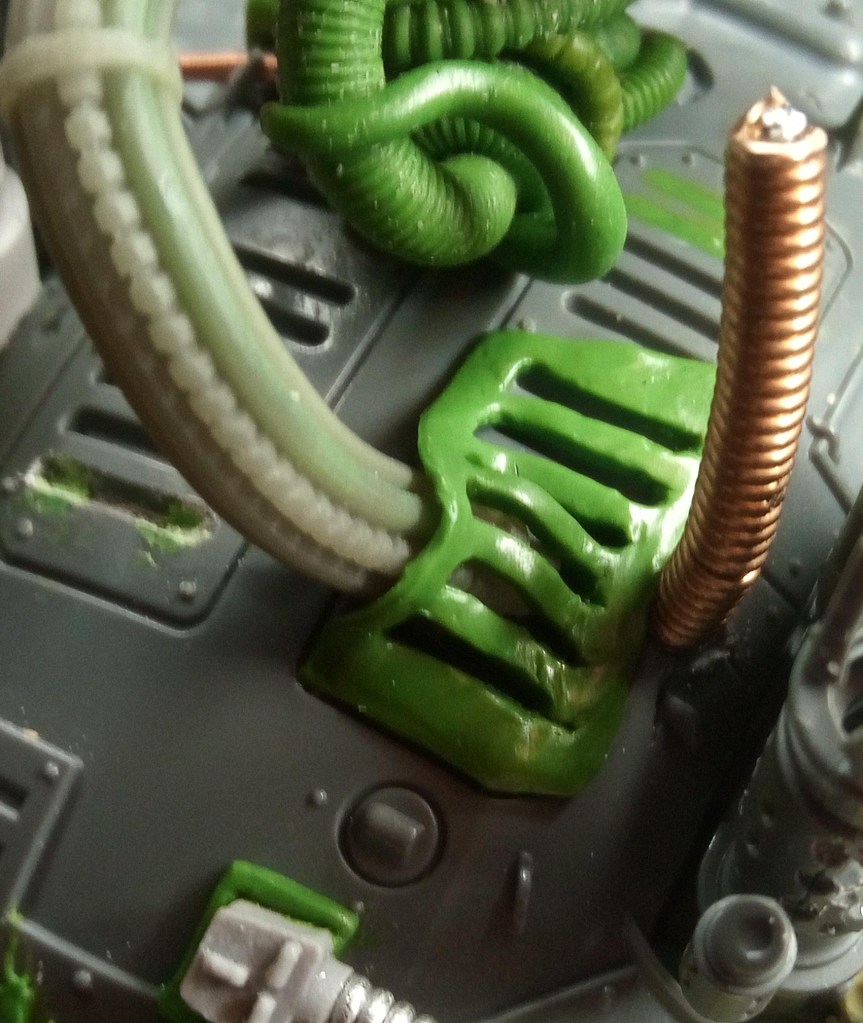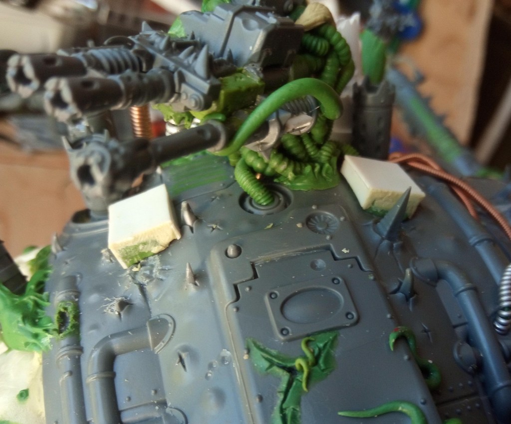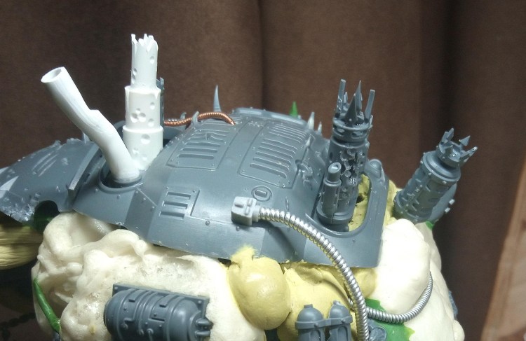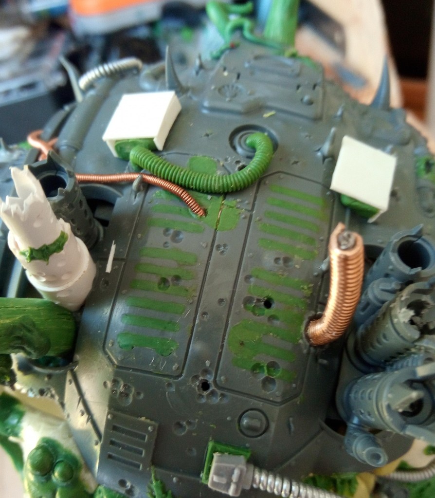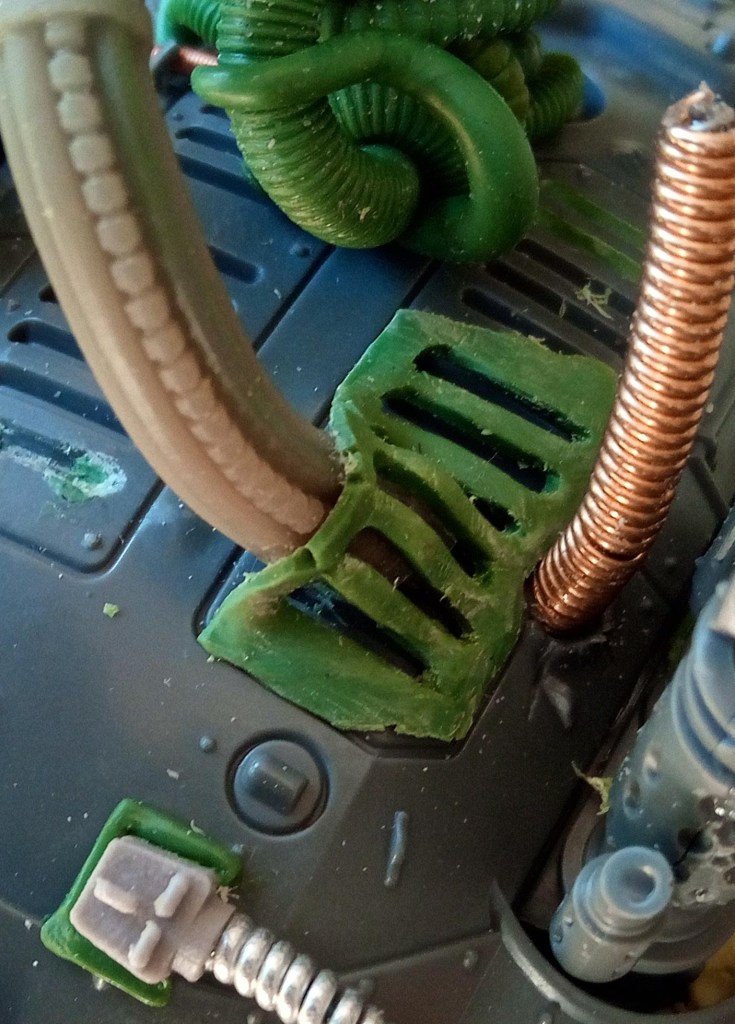 Now the bit with the bundled cabling met the hull, it had a magnet and two small pins (made from staples I think), to help lock it in the right place… but it was a bit of a faff to get it lined up because the give in the Zinge bundled cable meant it wouldn’t necessarily line up correctly. To fix this I decided to extend the buckling metal and lock its position in with that of the gun cables, that would mean that it couldn’t move around independently and it should in theory make it a lot easier to slot into place. Then I just had a quick look over the top of the model and added some Milliput growths on the wrecked pauldron and carapace.
