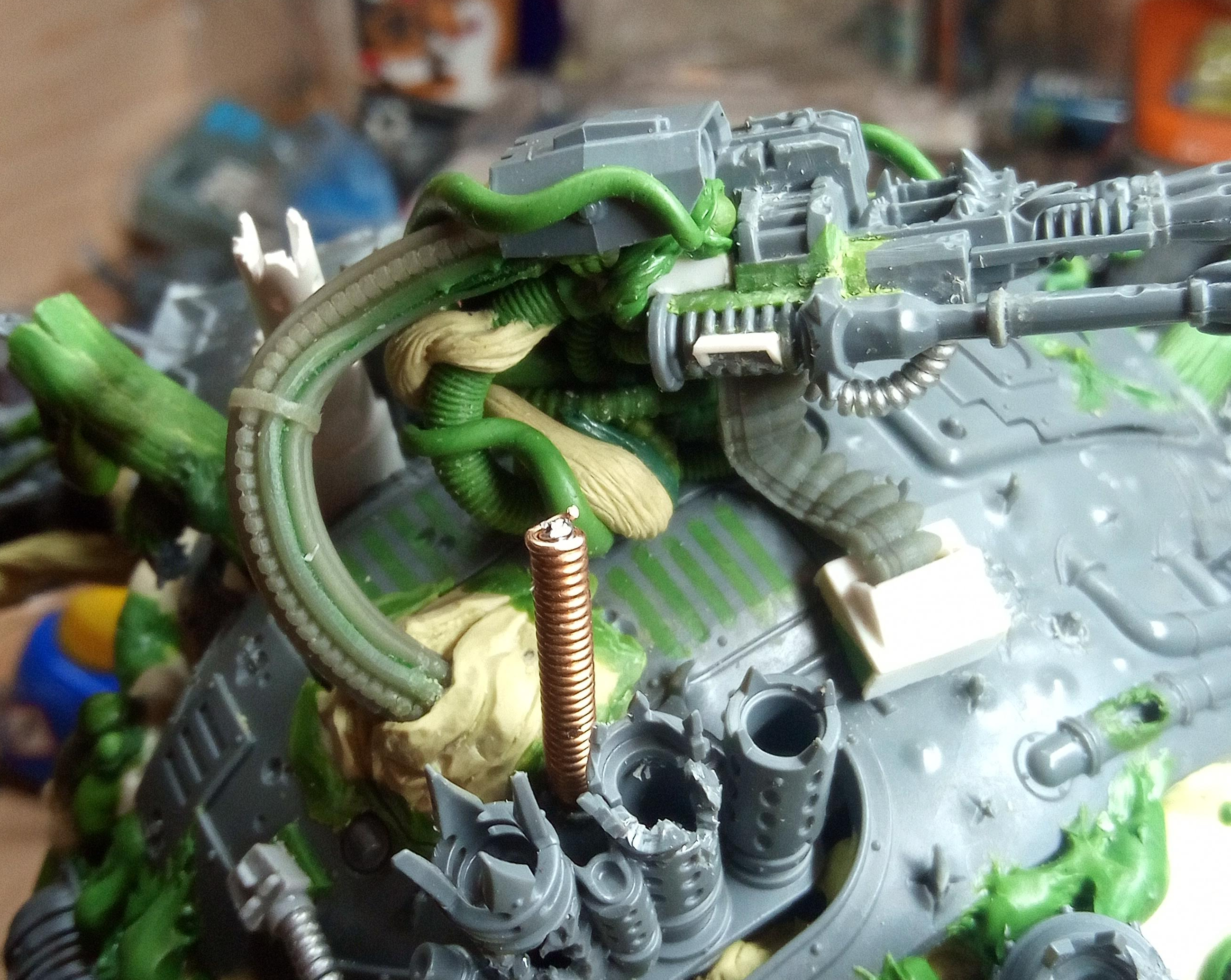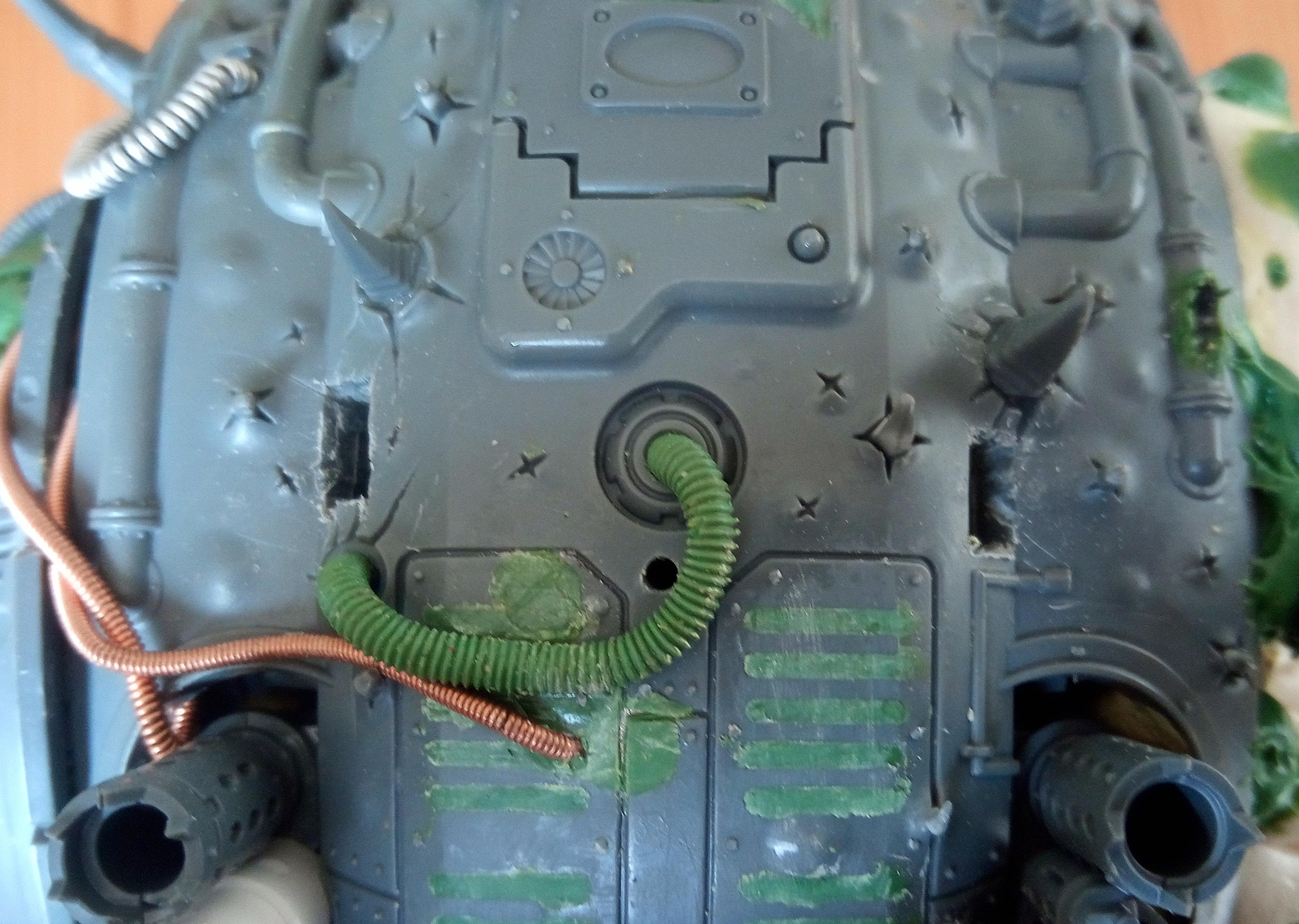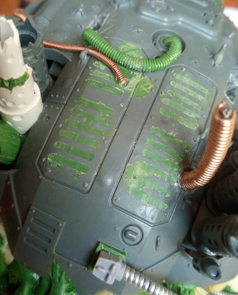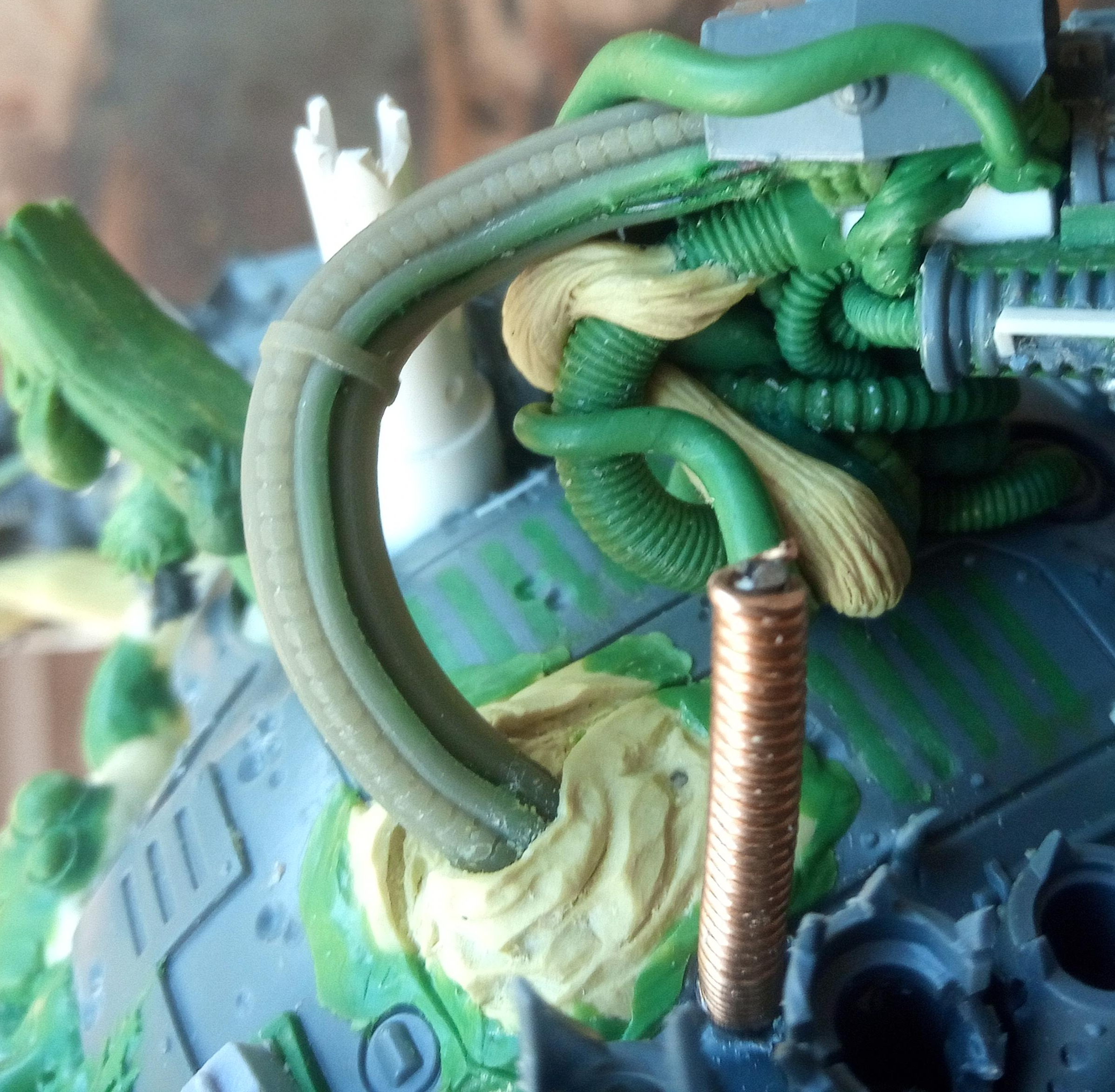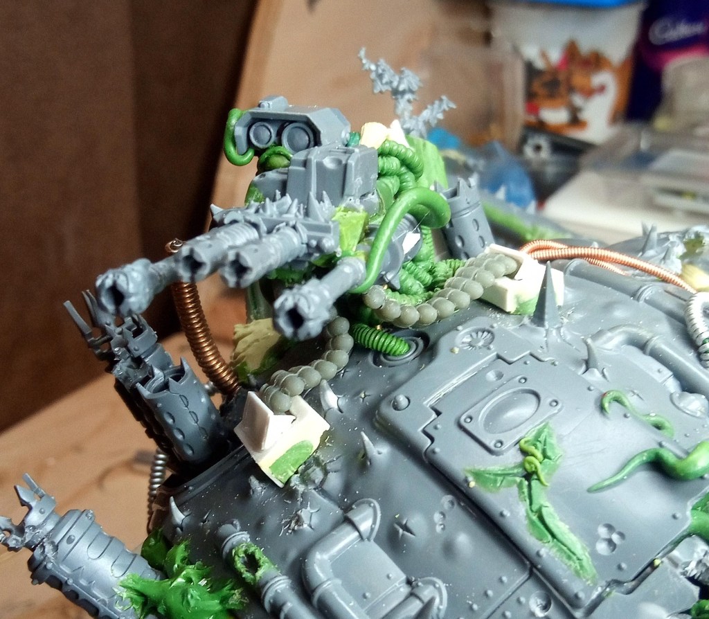 Now the bit with the bundled cabling met the hull, it had a magnet and two small pins (made from staples I think), to help lock it in the right place… but it was a bit of a faff to get it lined up because the give in the Zinge bundled cable meant it wouldn’t necessarily line up correctly. To fix this I decided to extend the buckling metal and lock its position in with that of the gun cables, that would mean that it couldn’t move around independently and it should in theory make it a lot easier to slot into place. Then I just had a quick look over the top of the model and added some Milliput growths on the wrecked pauldron and carapace.