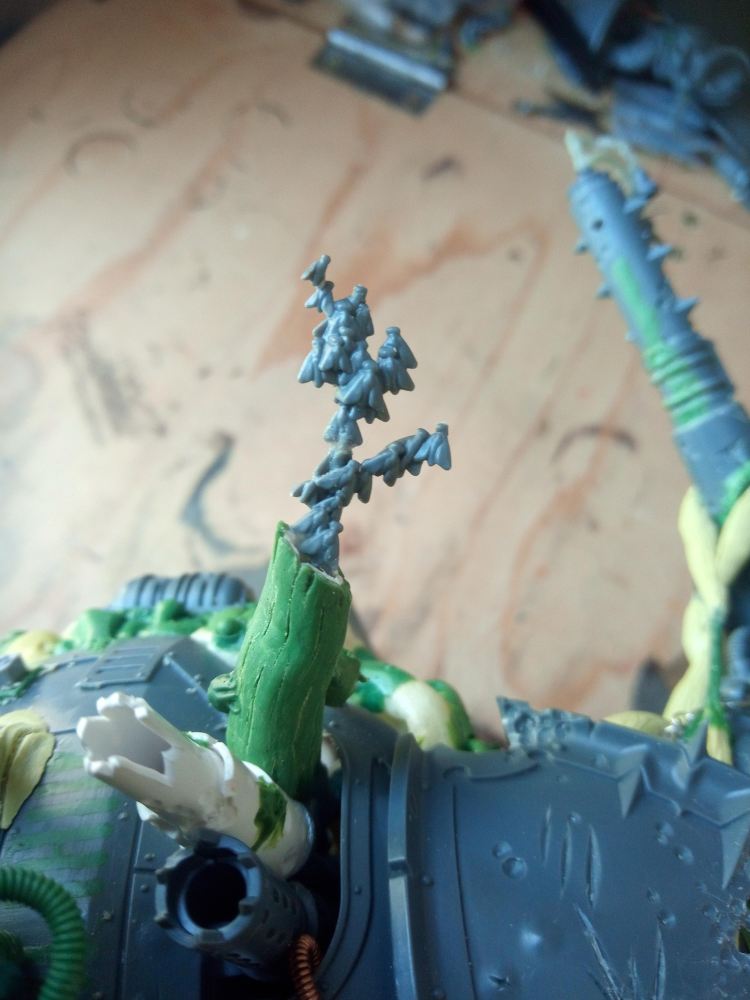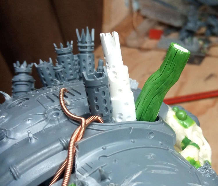 I wanted to add some details here and there around the top of the knight to supplement the existing differences between this build and other Knights. To start off with, this knight only has half of one shoulder guard, which already marks it quite differently, but an absence of pieces isn’t good enough, I wanted it to LOOK Nurgle, and not just have bits fallen off.