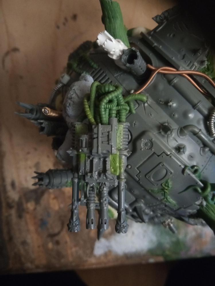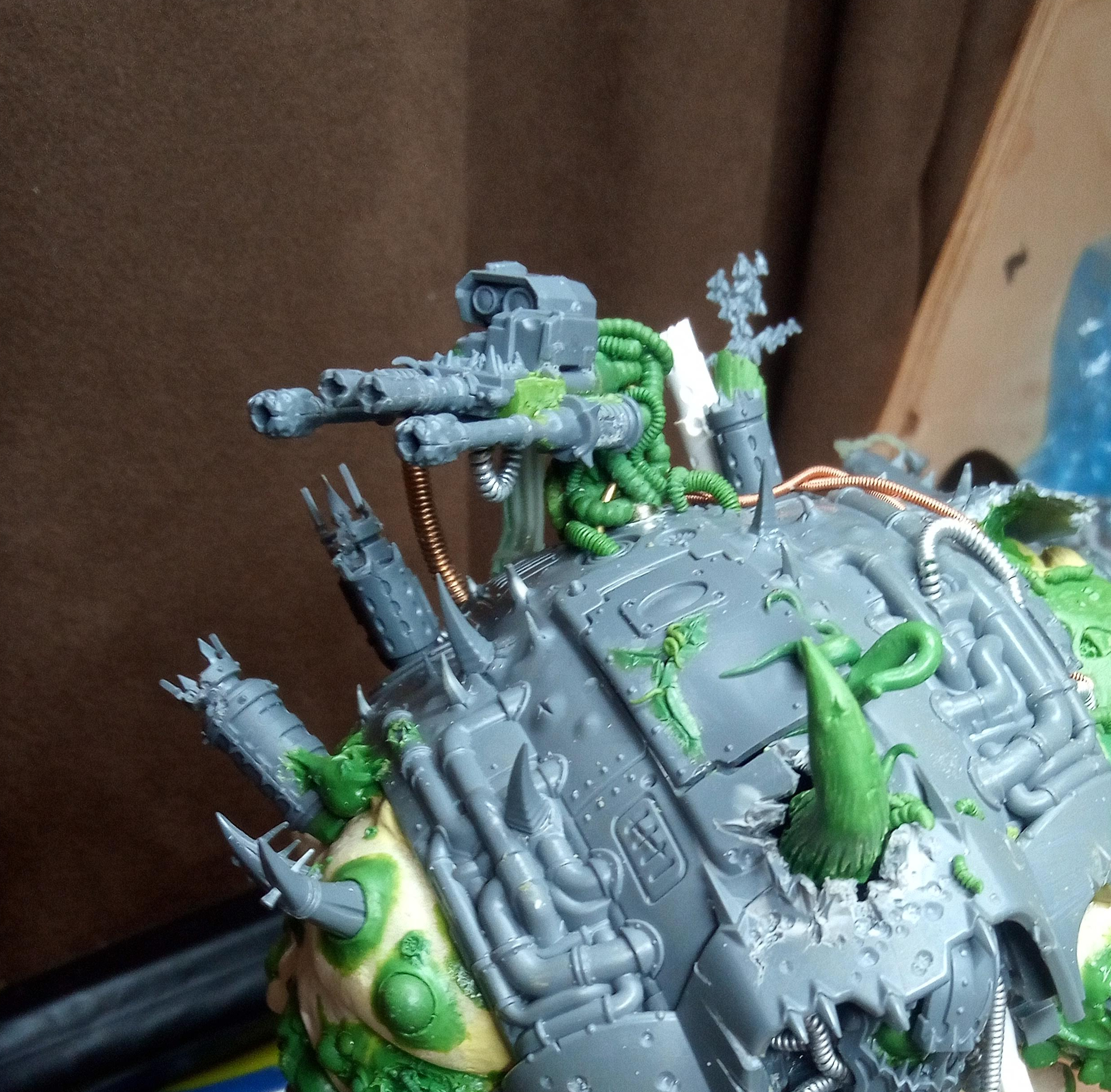 Ok cool. Cool, cool, cool, cool, cool, cool. I was giving it to him in one month from this point, I wanted it to have a carapace weapon, but I didn’t have a carapace weapon. So… I would just have to make one! I put a shout out on Twitter for anyone that had Nurgley looking ranged weapons and Bees came through for me again (these were not the first parts she had sent me). I had a Nurgle auto cannon and three Nurgle flamers… to make something.