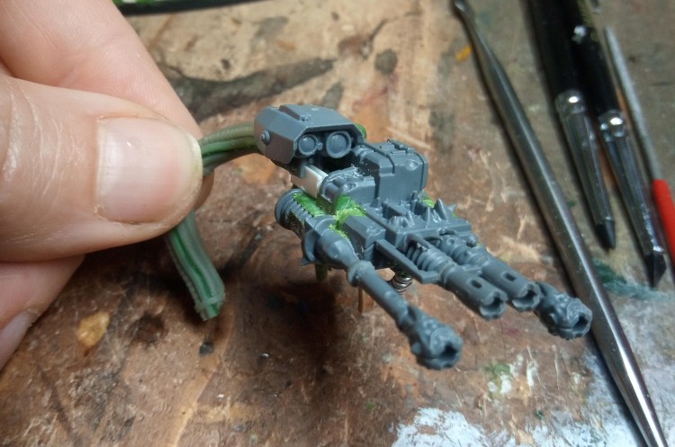So I had a sort of idea for how I wanted the gun to be suspended. I obviously didn’t have any of the mounting for the regular gun (not that any of that would have been a particular help with this unique pattern of gun). I would use a load of cabling made of green stuff to suspend it in a sort of organic fashion.