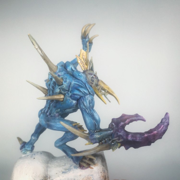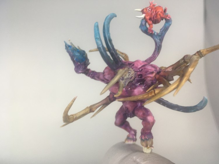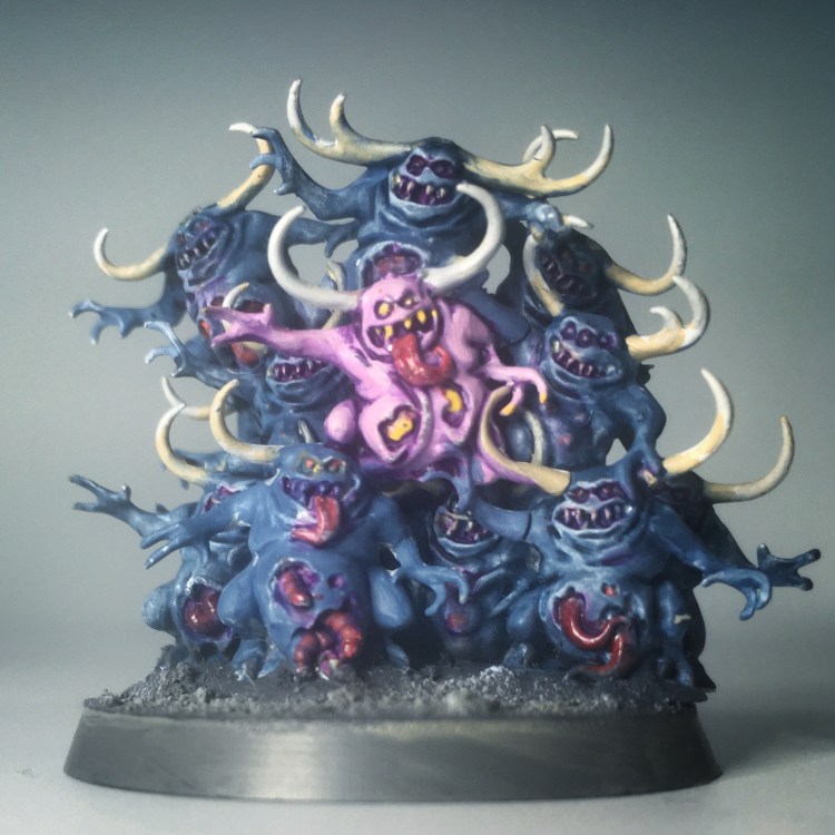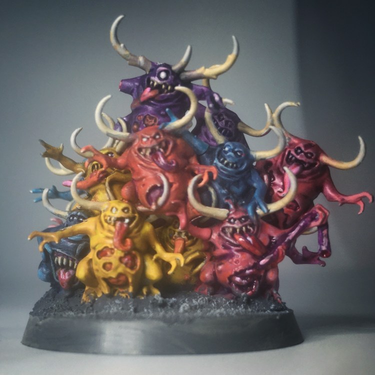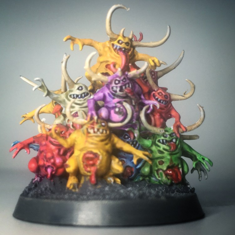 I really enjoyed switching up to daemons this month. Like orks, daemons kits have been around forever and have a certain look. I love painting nurglings and my only gripe with the kit is that having individually painted each one in a different colour, almost all the effort is hidden when the kit is glued together.