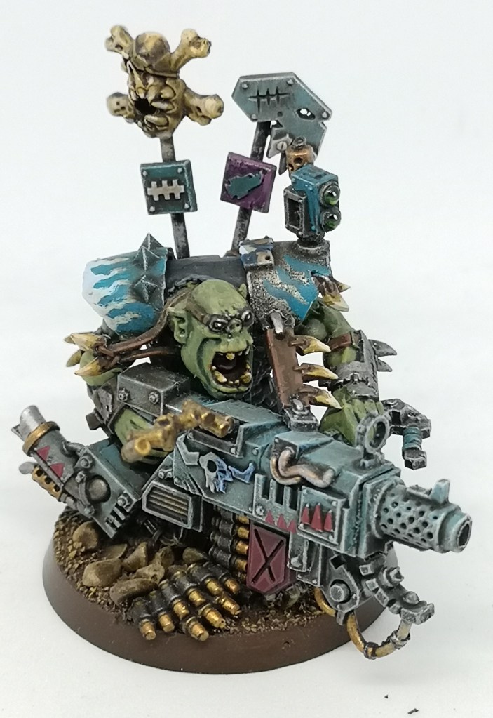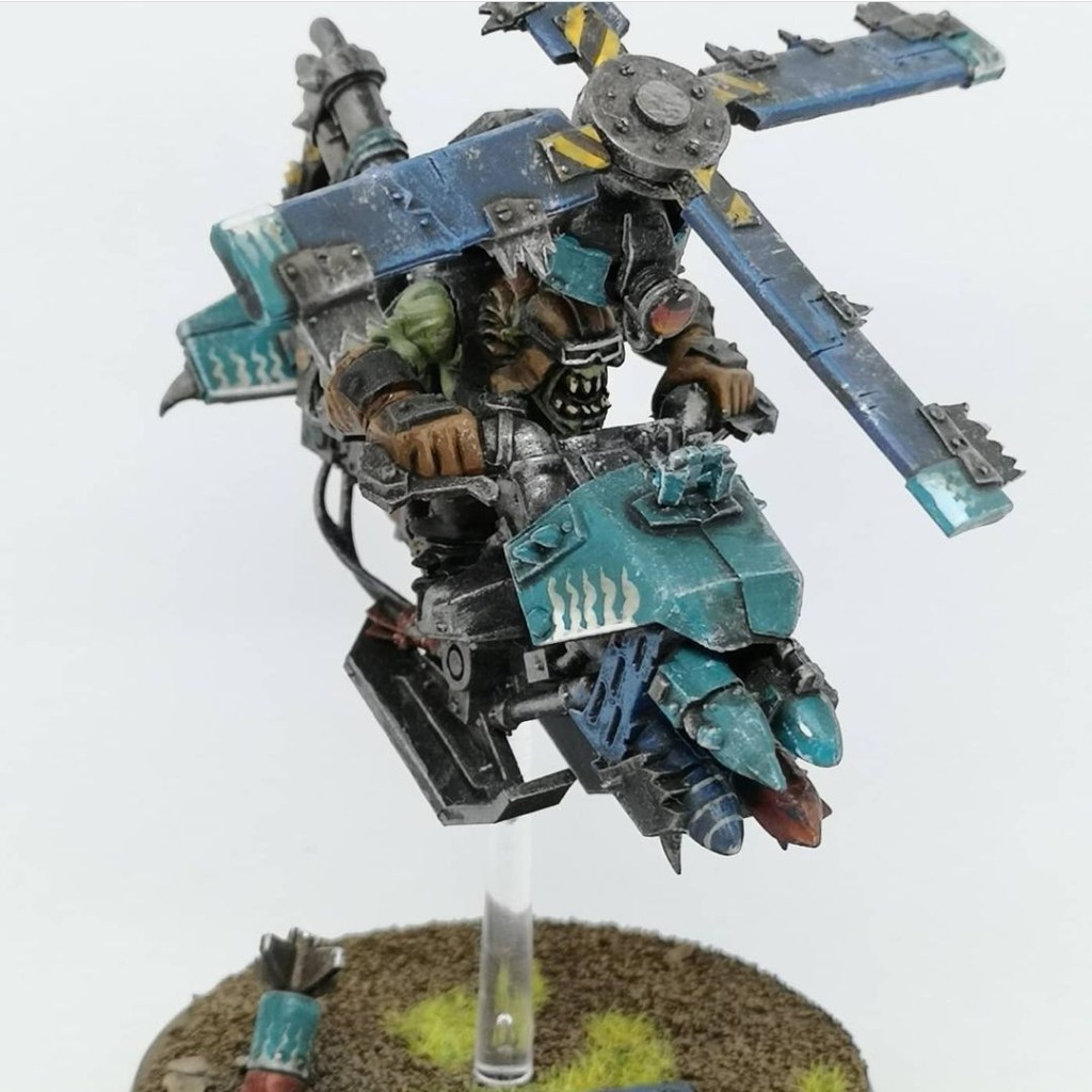 I’d seen someone put a dud rocket on the base of an Ork model before so had to do that, seemed so Orky. White flames on Turquoise again here. It’s my favourite pattern to do.