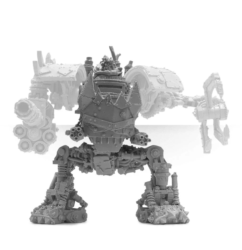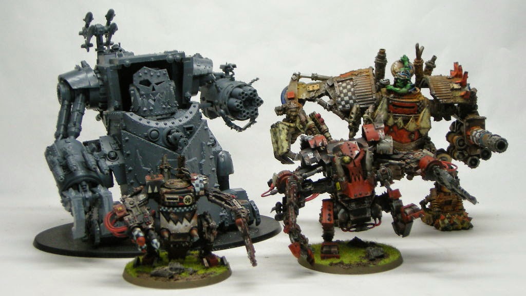 It soon became very clear to me that this was getting quite big… much bigger than a Deff Dread should be, so I wondered what the next biggest thing was. If a Deff Dread is a bigger version of a Killa Kan, Whats bigger than a Deff Dread? Than Asnwer, is a Mega/Meka Dread. Here is a size comparison of some of the Ork walkers from Watching Paint Dry. Next to it is a picure of the Dread from the Forgeworld website, beause there is no plastic model.