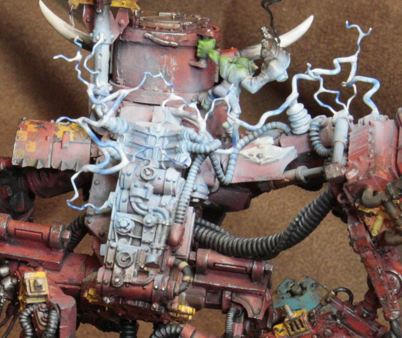 Oh yeah and the lightening… so I was litereally ready to post this off to Germany the following day when Warbringer sees it and says “that looks great! you know what I think you need to do though, put a bit of glow and OSL on and around those little tesla coils at the back…”. I thought, yeah… good idea! I have time for that… or… I COULD HAVE LIGHTENING ARKING OFF THEM!!??!”. well the idea was in there now, I had 3 days before my hard deadline, so I spend the next couple of days making the lightening and then making the bold step of painting the lightenings OSL over the paint job i had already tried to do will, using the airbrush that I wasnt confident with to do it. I think it turned out pretty well!