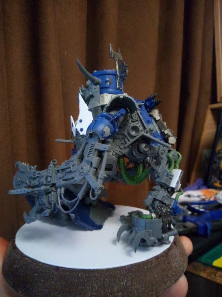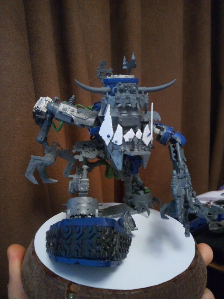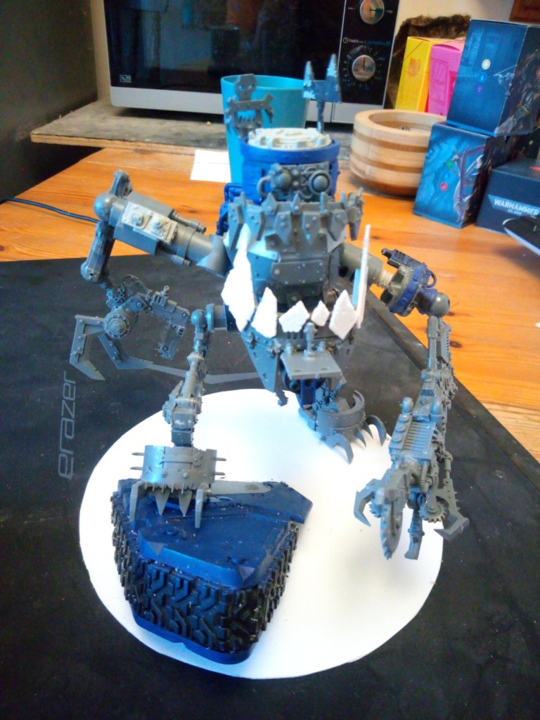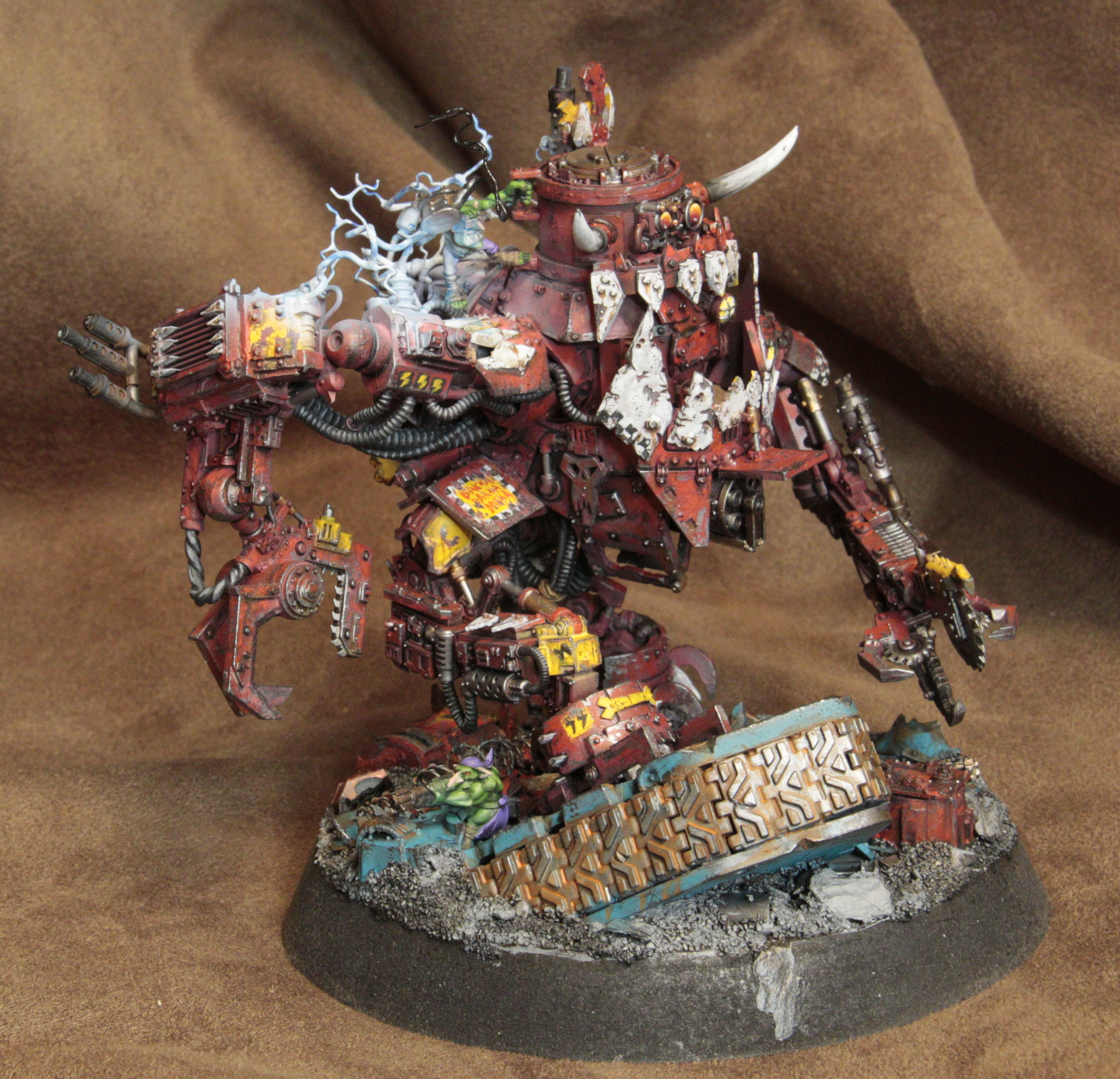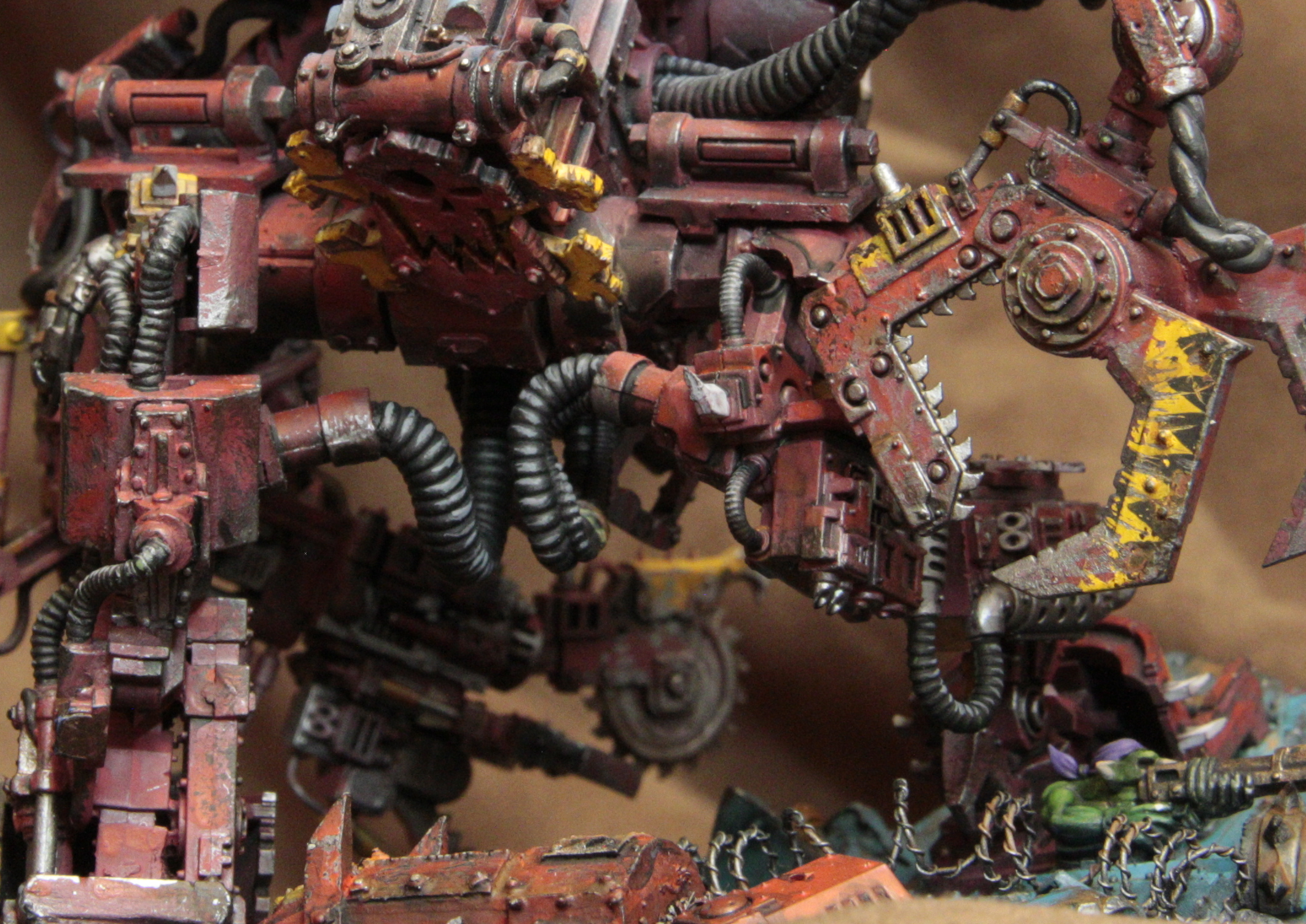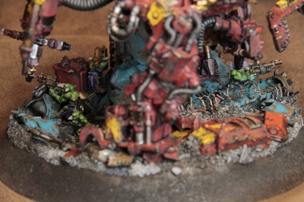 Once I was satisfied enough with the bulking, I had to crack on with the basing. I got some grots of Krakendoomcool and I thought it would be cool to make it look like there was like a bit of trench warfare going on down there, unbeknownst to the oblivious robotic menace stomping about over head. Once I was done with the basing I had to get on with painting. I remember not being completely happy with the bulking I had done… I felt like it was enough, but not ideal. the circumstances as they were though, I was on a deadline and I had maybe 3 weeks to paint this thing, so I had to just suck it up and hope that when it was painted it would still look ok.