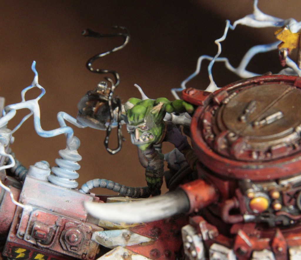 You can see where I used the weathering solution on things like the worn checkered patterns. the rest of the weathering was just painted on the old fashioned way, spunged on rhinox and silver. Oh in that picture you acn also see the little oiler grot holding on. I was quite happy with how all the grots came out, adding a bit of narrative to the mini (I wanted it to be quite a narrative thing because I wasnt sure it would ever be used in a game, so I at the very least wanted it to look nice just sat on a shelf).