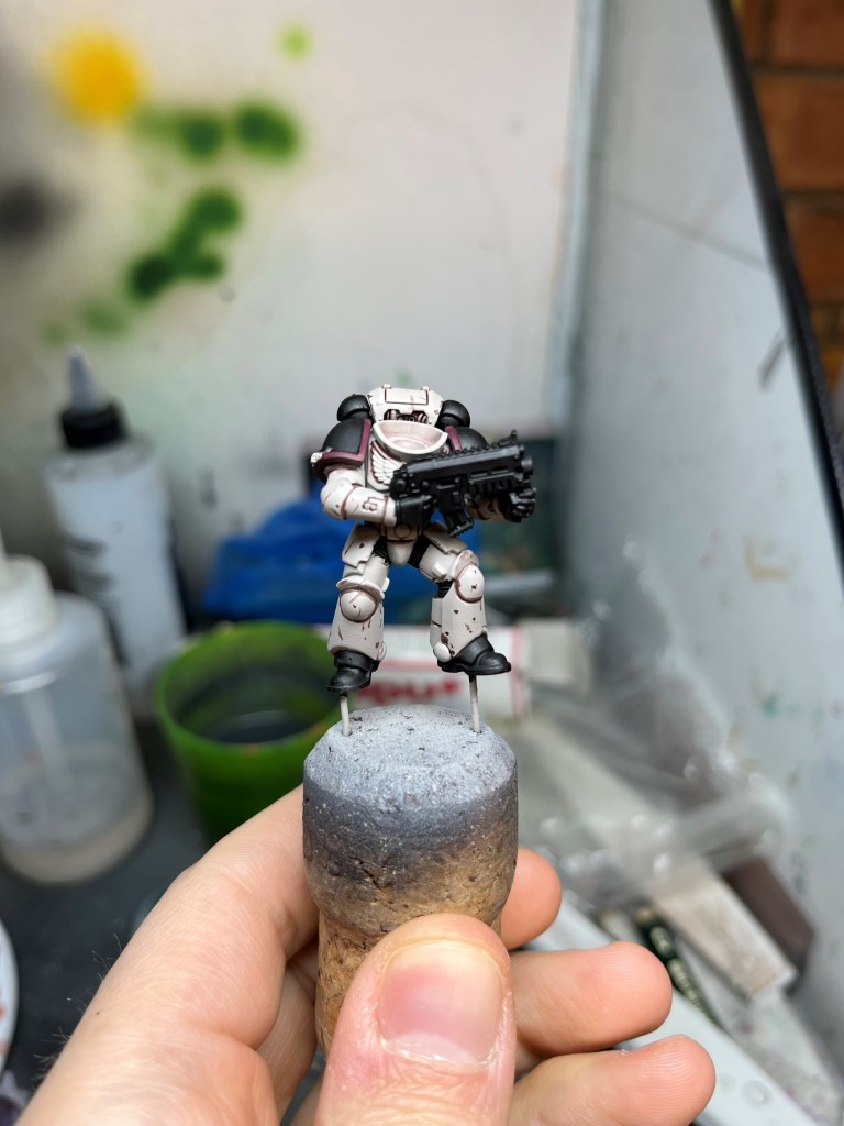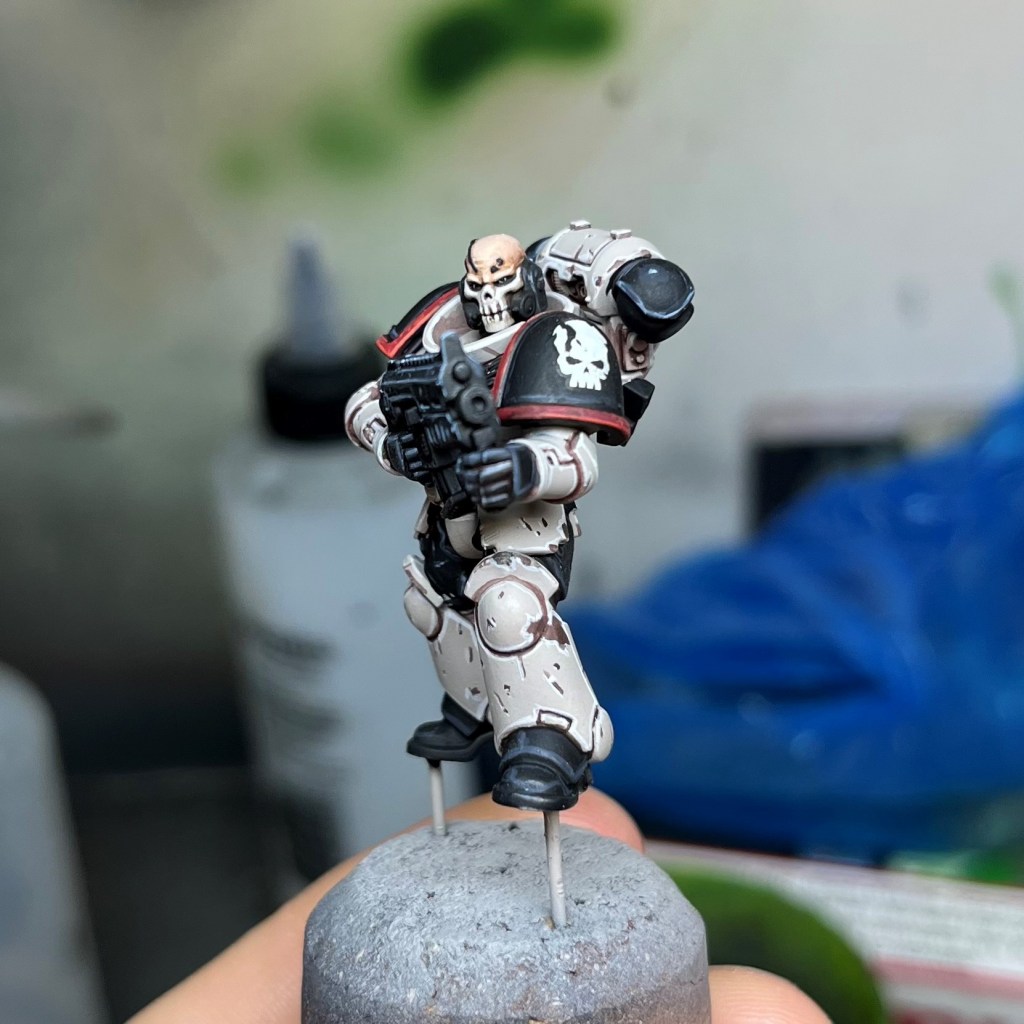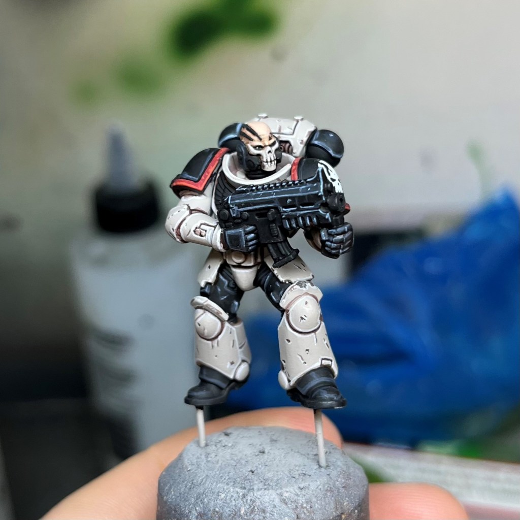 Doing some research I just couldn’t find much, I did some soul haunters which are a blast to paint but ultimately someone elses homebrew chapter and I found it very formulaic. I was re-listening to the Uriel Ventris books that I read many a moon ago and there they were, the mortifactors. I started researching and found they were in the 3rd war for armaggeddon (one of my favourite parts of the lore). They were second founding just just sang to me, I liked the artwork and thought I could change a couple of elements of their scheme to make it more fun and quick to paint. Namely the elbow and thigh plates/covers that are black in the artwork, I’ve chosen to use the bone colour.